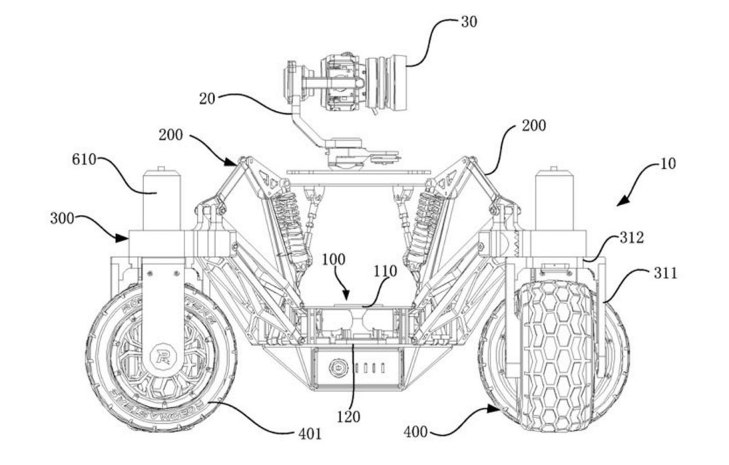 La patente china, publicada por primera vez por DroneDJ, muestran una plataforma de vehículo de aspecto bastante serio con neumáticos gruesos y un estabilizador de cámara estabilizado. Como se puede ver en la imagen de arriba, el soporte de la cámara está protegido contra golpes por resortes y neumáticos, que sin duda reaccionarían activamente ante movimientos bruscos.