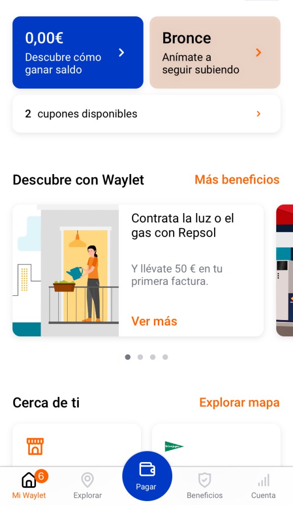 - Mi Waylet. Este apartado nos indicará los comercios que tenemos cerca donde podemos usar la aplicación (para lo que usa nuestra ubicación). Veremos las notificaciones importantes, y también podremos cotejar los últimos movimientos de las compras o pagos que hayamos hecho