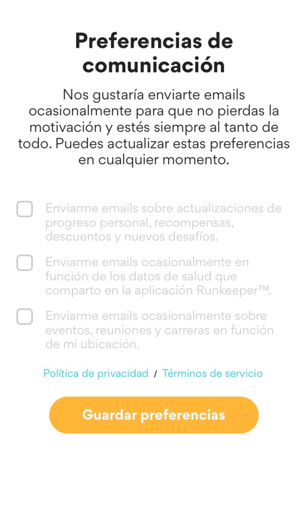 - Acto seguido nos irá pidiendo una serie de permisos que establecerán las preferencias de comunicación entre el desarrollador y nosotros. Aquí entra en juego el nivel de intrusismo que le vamos a permitir a la aplicación. Hay quién quiere recibir notificaciones para que le animen a salir a correr y hay quién no quiere recibir mensajes ni avisos bajo ningún concepto. En cualquier caso todo esto es configurable.