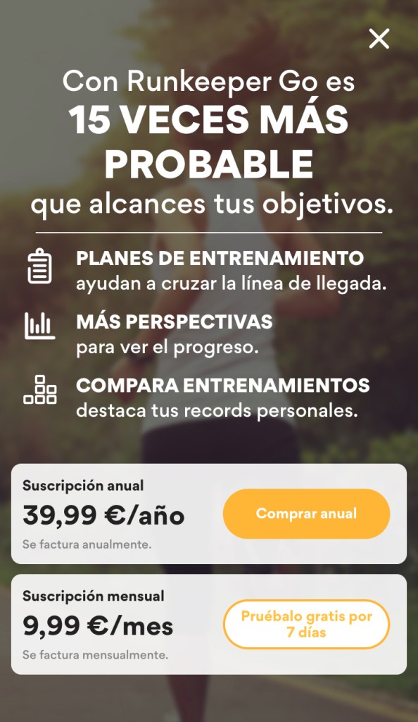 Como casi todas las aplicaciones de hoy en día, Runkeeper tiene un plan de pago a través de una suscripción mensual o anual. Esto incluye planes de entrenamiento personalizados, mas datos e información relevante para analizar la calidad de nuestra actividad y la opción de comparar entrenamientos a nivel global.