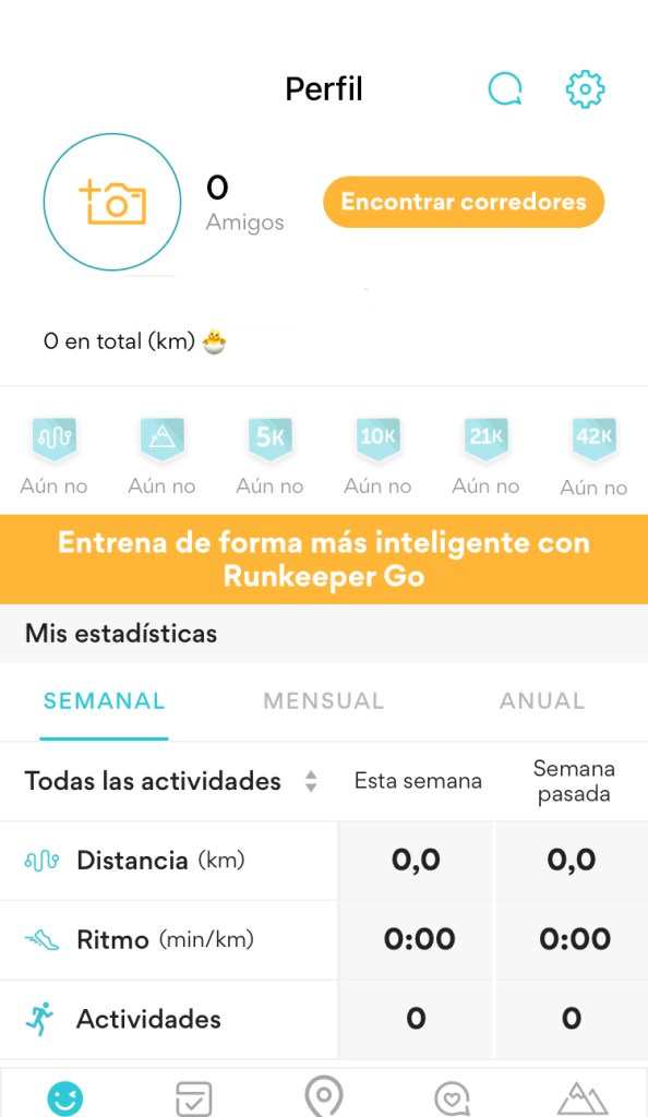 - YO. El acceso a nuestro perfil estará ubicado aquí. Dentro de esta opción tendremos la posibilidad de acceder a la configuración de la aplicación (arriba a la derecha de la pantalla) para cambiar los parámetros de la App. En la opción YO tendremos acceso a nuestros entrenamientos, podremos ver los retos que vamos superando y las gráficas sobre lo que hemos hecho y los objetivos que queremos lograr. Un compendio de nuestro datos para poder analizar nuestra tendencia al hacer deporte.