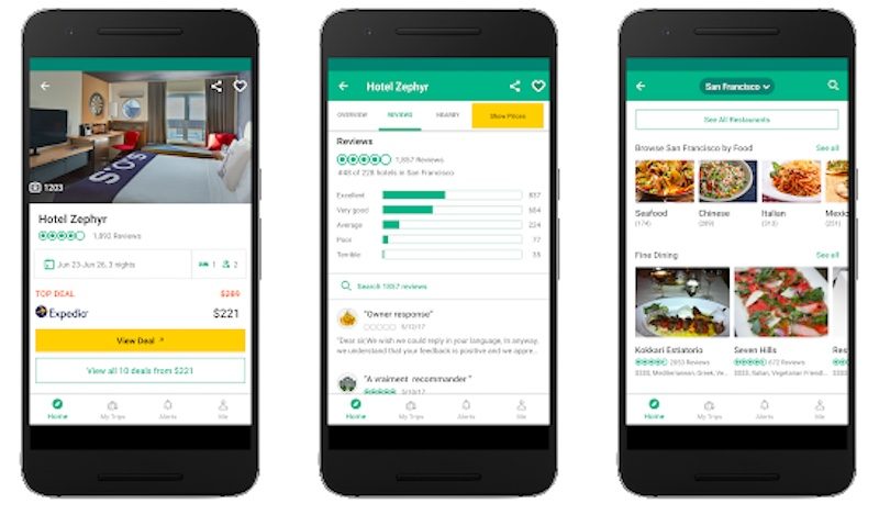 - INICIO. La pantalla de inicio de la aplicación nos muestra de un vistazo las principales características que nos ofrece. Aquí podremos ver: hoteles, restaurantes, cosas que hacer, alquileres vacacionales, vuelos y foros de viajes. Si entramos en cualquier de estas categorías nos pedirá la ubicación de donde queremos que busque para darnos un listado con fotos, valoraciones, precios y todo lo necesario para encontrar lo que mas se ajusta a nuestras necesidades.