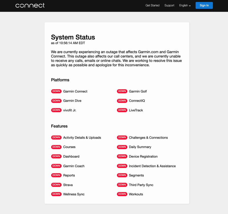 El incidente comenzó el Miércoles por la noche y continuó durante el fin de semana, causando interrupciones en los servicios online de la compañía para millones de usuarios, incluido Garmin Connect, que sincroniza la actividad del usuario y los datos con la nube y otros dispositivos. El ataque también derribó a flyGarmin, su servicio de navegación aérea y planificación de rutas. Algunas partes del sitio web de Garmin estuvieron fuera de línea durante días.