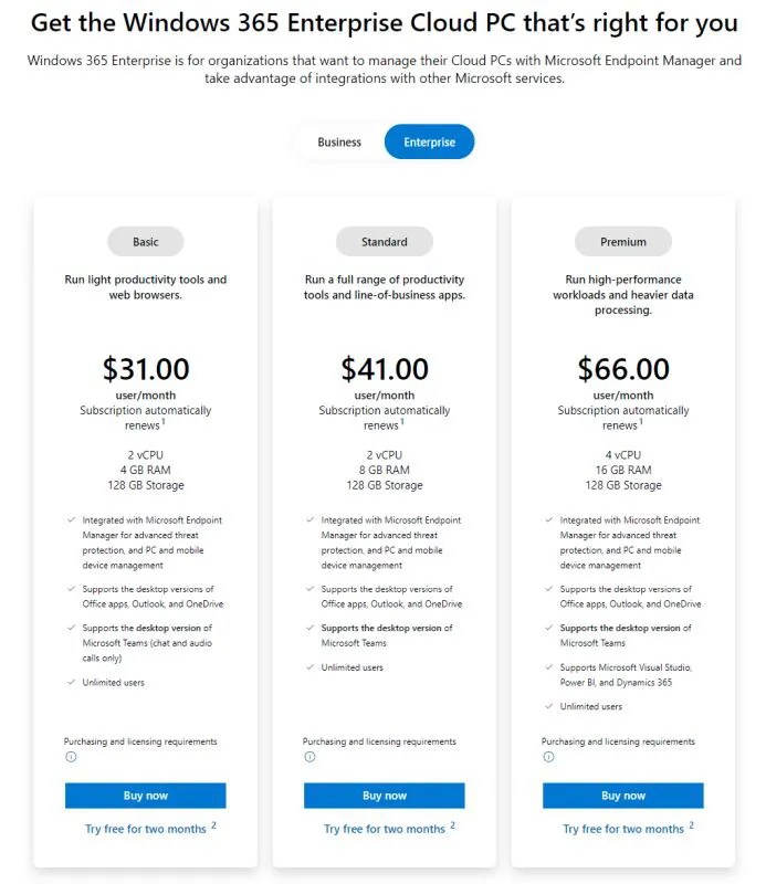 Después de que se anunciara, Microsoft reveló una opción de precio de 31 dólares al mes, por usuario para acceder a una instancia de PC en la nube con el equivalente a dos CPU, 4 GB de RAM y 128 GB de almacenamiento. Ahora que está disponible, la página completa de precios de Windows 365 revela más paquetes, listos para el negocio (300 asientos o menos) o suscripciones de nivel empresarial.