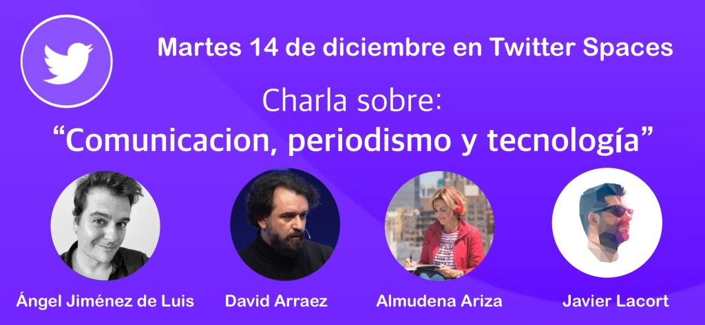 Javier López, el presentador del podcast de TecnoAp21, será el conductor de un espacio en Twitter Spaces el día 14 de diciembre. En el, los periodistas Ángel Jimenez de Luis, David Arráez, Javier Lacort y Almudena Ariza charlaran y abrirán el debate sobre cómo ha cambiado la comunicación este siglo 21, a raíz de la expansión de los diferentes canales de comunicación que hay disponibles. Uno de los puntos de interés será escuchar sus opiniones sobre el estado actual del periodismo. Que se ha visto afectado por la intrusión de otros medios de comunicación nativos digitales como YouTube, Twitch, los blogs y webs divulgativas, o las diferentes redes sociales.