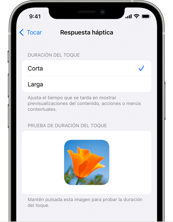 - Aquí aparecerá la configuración de «Duración del toque», donde se podrá elegir entre «predeterminada», «rápida» o «lenta».