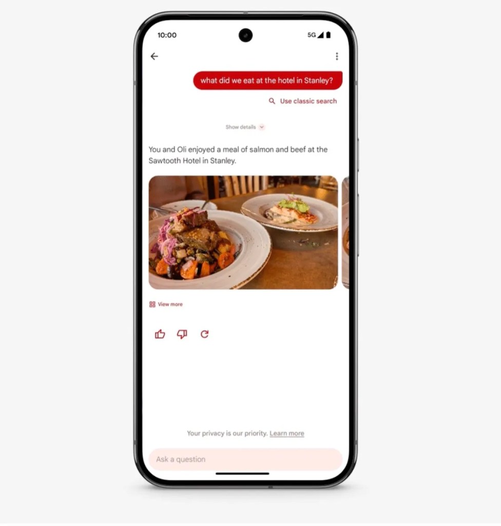 Hasta ahora, Google Photos permitía búsquedas simples, basadas en identificar personas, lugares o elementos específicos dentro de una fotografía. Sin embargo, con la introducción de «Pregunta a Fotos», los usuarios podrán formular preguntas más complejas, como por ejemplo, «¿Cuál es la mejor foto que tomé en mis viajes a los Parques Nacionales?» o «¿Qué comimos la última vez que estuvimos en este restaurante?». La inteligencia artificial evaluará las imágenes no solo por su contenido, sino también por factores como la calidad de la imagen, la iluminación, la claridad y la ubicación geográfica.