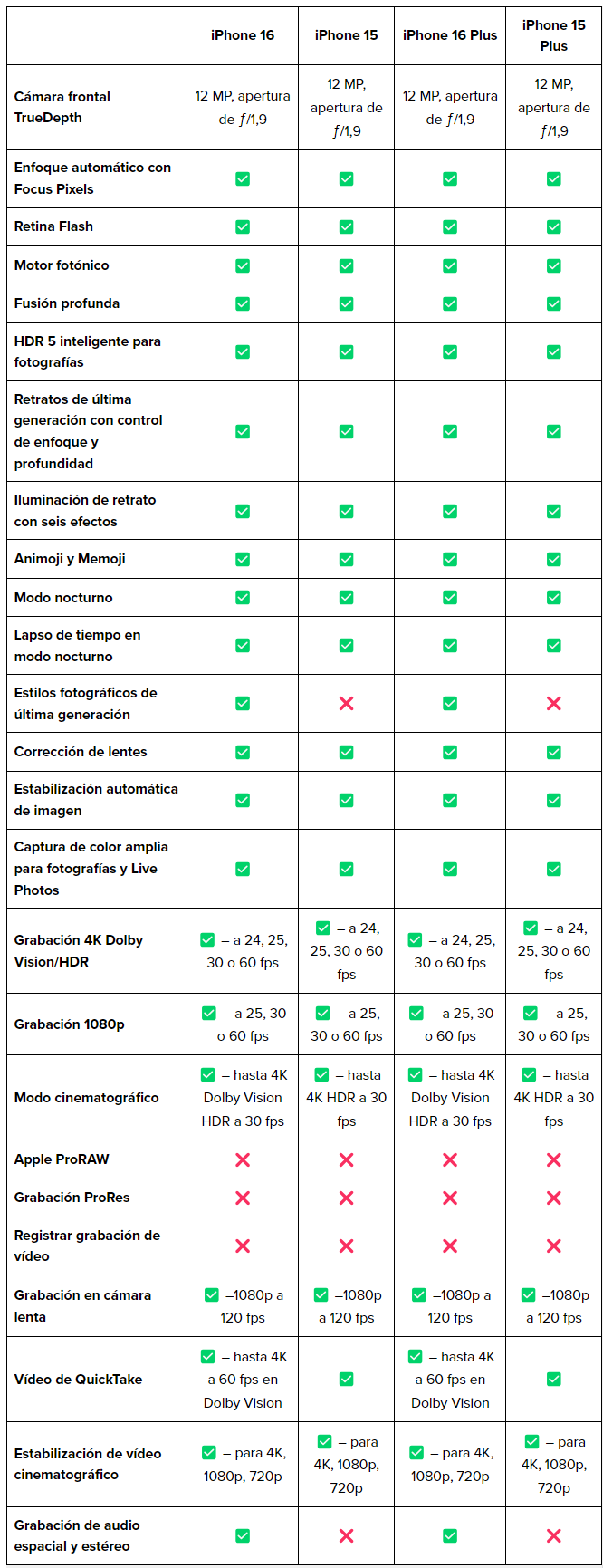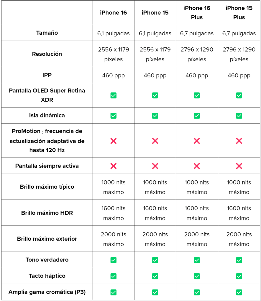 En términos de pantalla, no hay grandes diferencias entre el iPhone 16 y el iPhone 15. Ambos modelos cuentan con las mismas opciones de tamaño: 6,1 pulgadas para los modelos estándar y 6,7 pulgadas para las versiones Plus. También comparten la misma resolución y brillo de pantalla, así como la tecnología de pantalla Super Retina XDR, por lo que los usuarios no verán grandes cambios visuales en el uso diario.