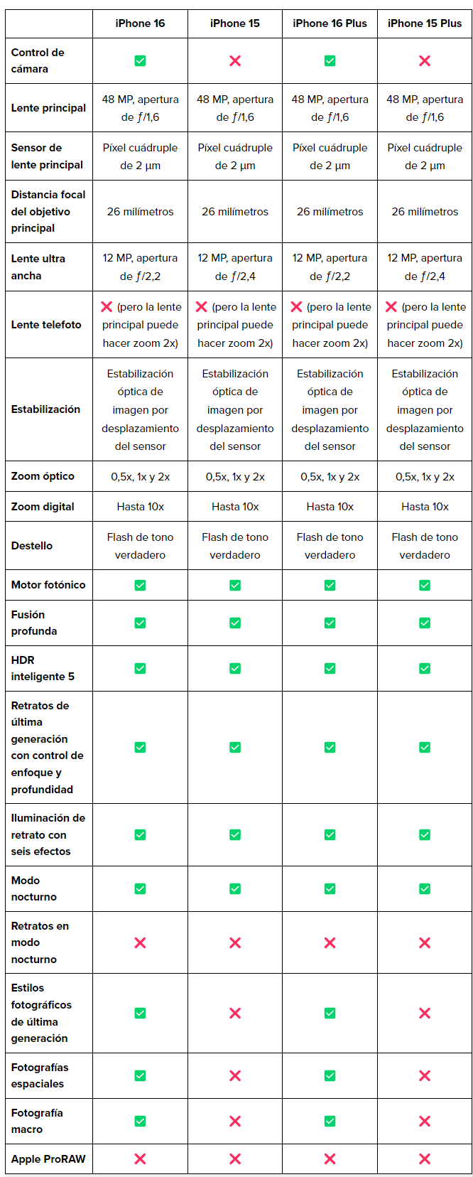 Ambos dispositivos cuentan con una cámara principal de 48 MP, pero el iPhone 16 ha dado un paso más allá con la capacidad de capturar fotos y vídeos espaciales, ideales para su visualización en el Apple Vision Pro. Además, el nuevo botón/sensor de control de cámara facilita la toma de fotos y vídeos, lo que convierte al iPhone 16 en una opción más atractiva para los aficionados a la fotografía.