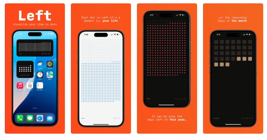 • Frente a «WeCroak»: mientras WeCroak envía recordatorios diarios sobre la mortalidad, Left lo visualiza con una línea del tiempo más clara.