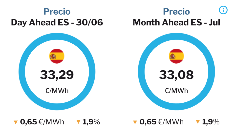 - Precio «Month Ahead» (mes siguiente): indica el precio medio al que se prevé que se cierre el mercado para el mes siguiente. Su valor actual esta en el centro del círculo, con una reducción y subida de precio (abajo a la izquierda) respecto a la última referencia. A la derecha marca el porcentaje de descenso o subida.