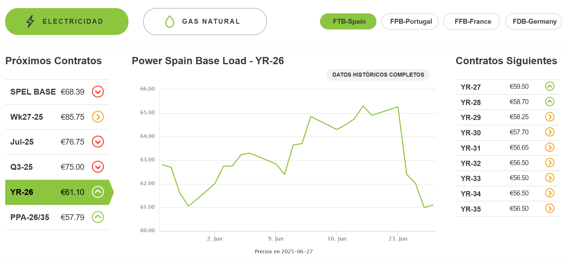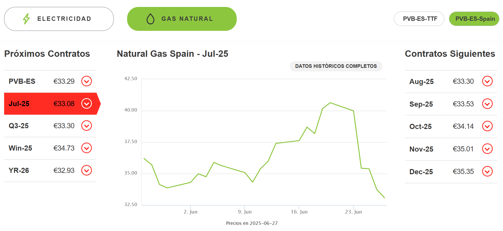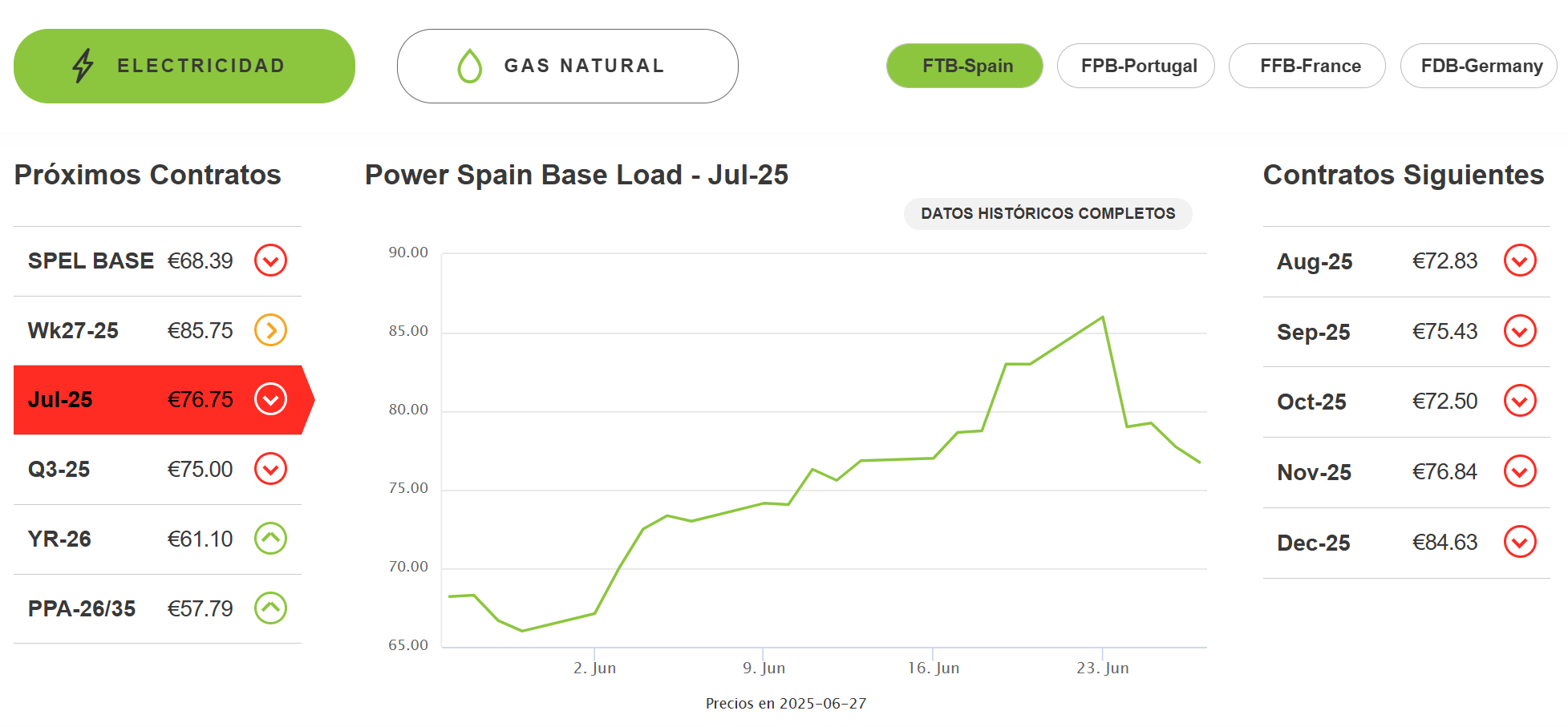 - Observar variaciones diarias: las flechas muestran si los precios están bajando o subiendo y en qué porcentaje. Este tipo de gráficos es útil para consumidores y empresas que desean ajustar su consumo energético según las tendencias del mercado.
